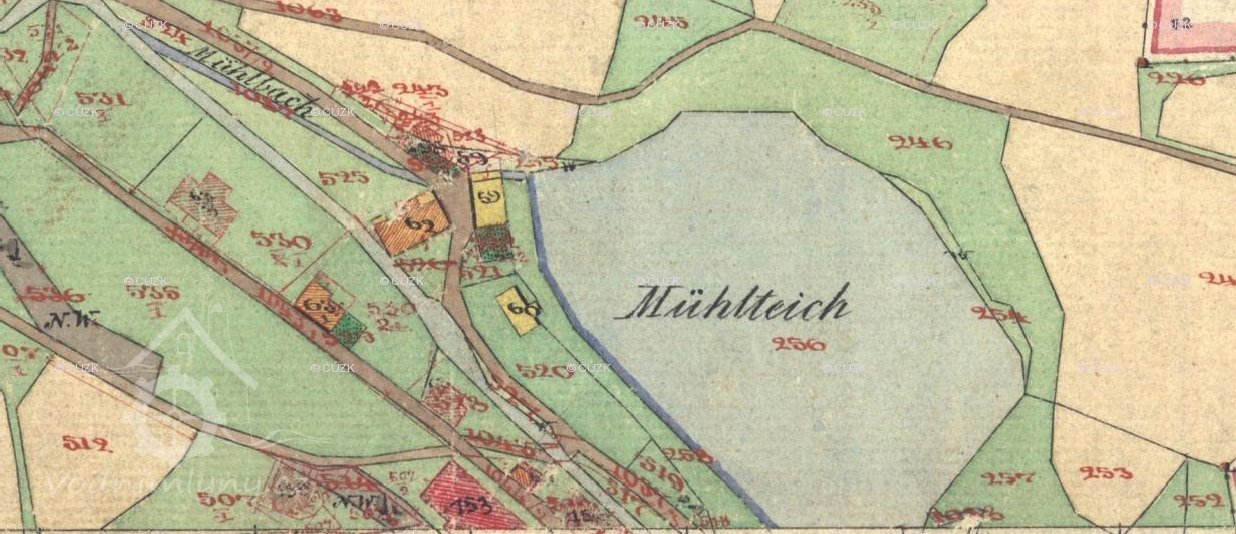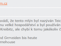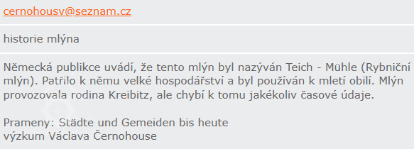 Německá publikce uvádí, že tento mlýn byl nazýván Teich - Mühle (Rybniční mlýn). Patřilo k němu velké hospodářství a byl používán k mletí obilí. Mlýn provozovala rodina Kreibitz, ale chybí k tomu jakékoliv časové údaje. (Prameny: Städte und Gemeiden bis heute)