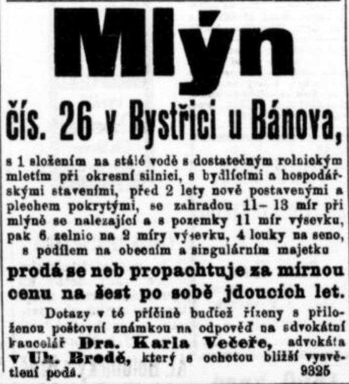 1902 mlýn nabízen k pronájmu nebo prodeji. (RR)