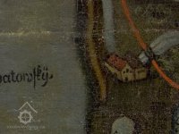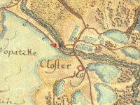 výřez z mapy - nejstarší zachované vyobrazení objektu Op. mlýna, 1684, © Mapa třeboňského panství z r. 1684 (se dvěma pohledy na Třeboň - od východu a západu); renovováno 18
