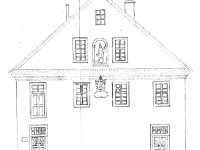 podkroví před přestavbou; mezi okny černý čtvereček: uchycení sochy Floriánka umístěné ve výklenku v průčelí, 1960-62, Karel Skopal st., z publikace R. Novákové "Opatovický mlýn na Zlaté stoce u Třeboně"