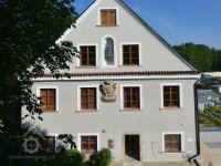 barokní kartuše v průčelí připomínající obnovení mlýna po požáru 1727, 1960-62, © Karel Kopal st.