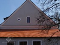 Při přestavbě objevená starší okno a větrací otvory v severním štítě mlýna, 2015, © Ondřej Prášil, (Prvky na obrázku: okno, plastická omítková výzdoba fasád a štítů)