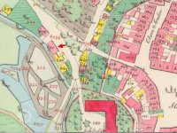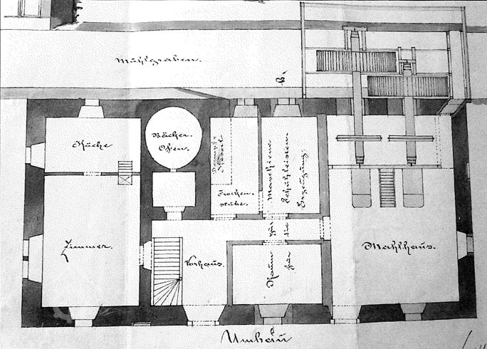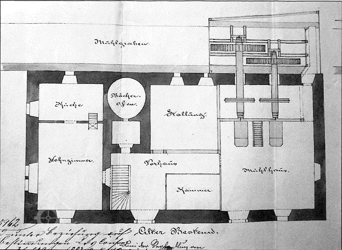 1883: přízemní budova se vstupní síní, z níž byla přístupná černá kuchyně a pec na chleba, vedle níž se nacházela stáj. V lévé části kuchyně a obytná místnost, v pravé mlýnice.