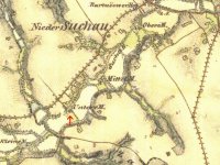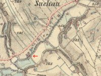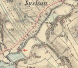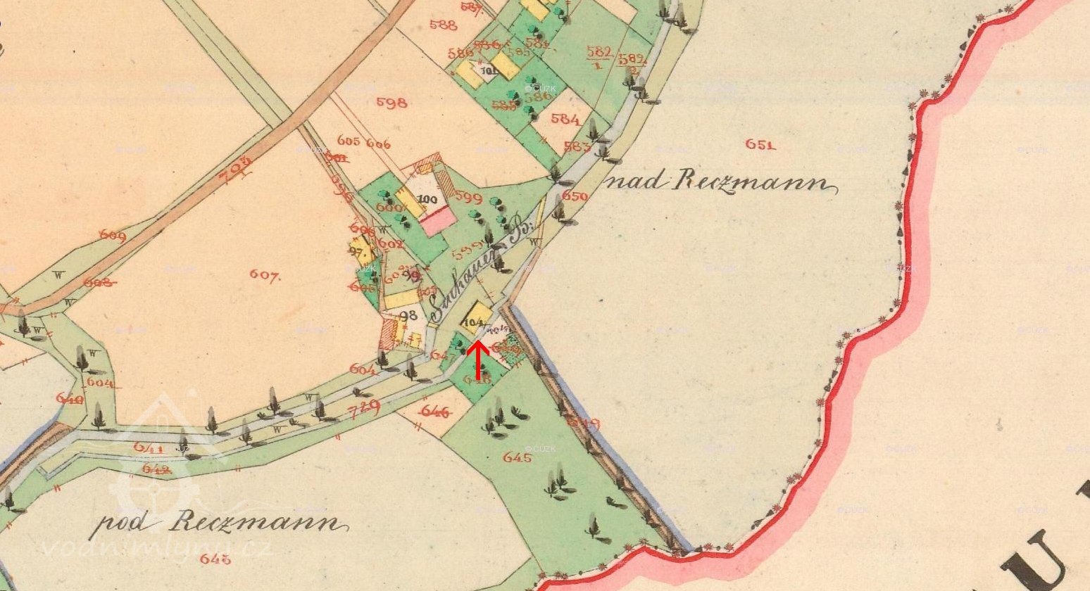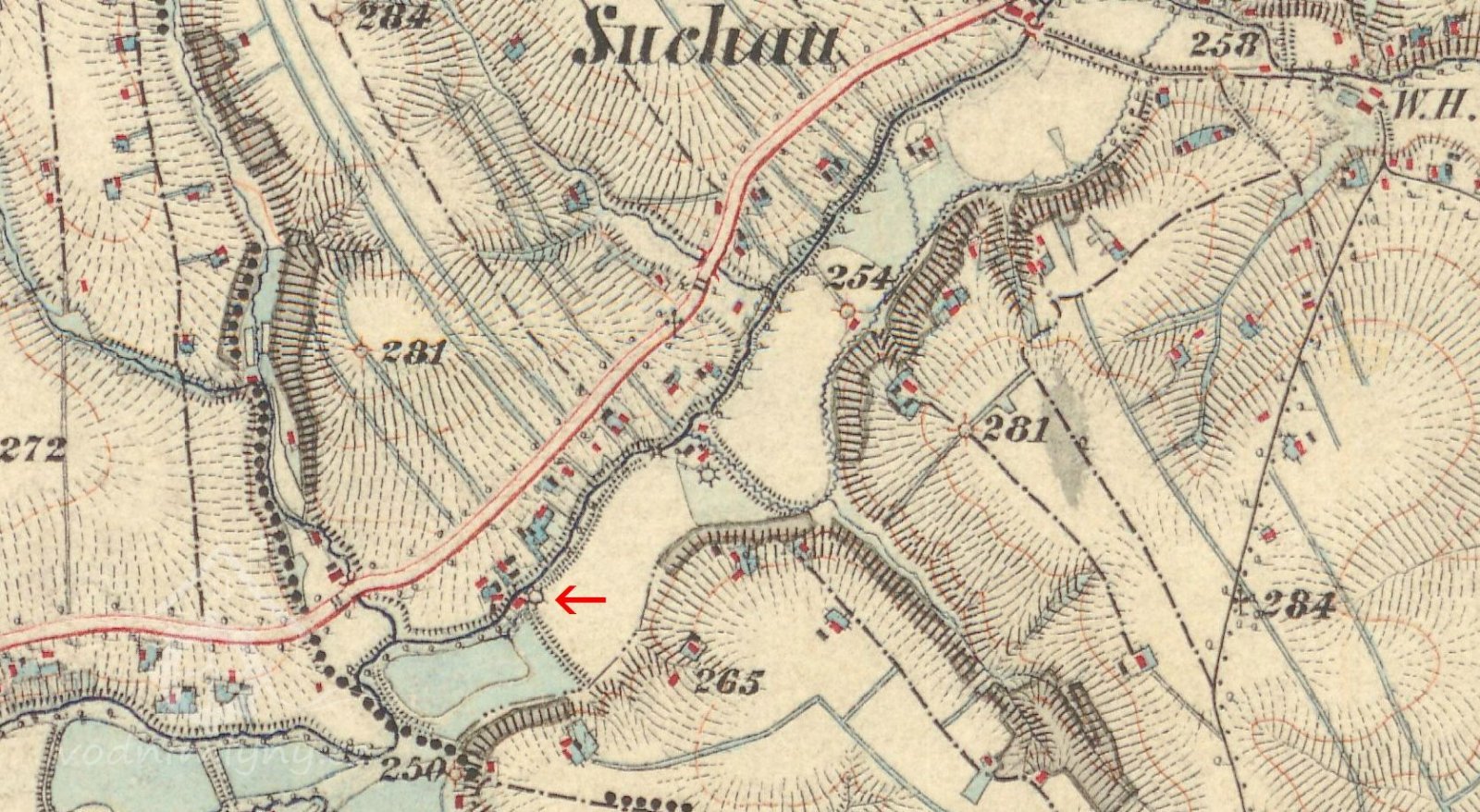 Mlýn zakreslený na historických mapách stál u hráze bývalého rybníka.