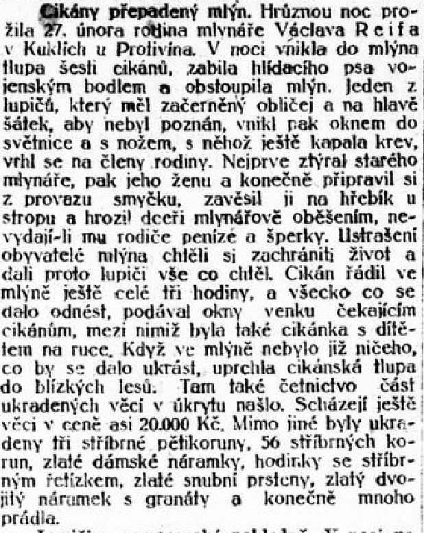 Této vraždě byl přítomen i cikán Růžička, kterému synové zavražděného cikána Ištvána slíbili krevní pomstu proto, že jejich otce nebránil. Tuto silnou touhu po krevní pomstě podněcoval v nich Fiala, který v lese u Lhotic dne 16. října 1920 zavraždil spolu se svými kumpány cikána Malíka. Vrazi se rozprchli a teprve 24. prosince 1920 vrátili se na Budějovicko, kde v lese u Vitína srazili se s cikánem Vrbou, kterého Fiala zastřelil na místě proto, že prý ve válce mu odloudil milenku. Fiala byl zatčen avšak prchl z vězení. Po svém útěku z vězení spáchal neslýchaný, ohavný čin dne 27. února 1922 u obce Paseky na Písecku u Protivína. Za temné noci, kdy celá krajina byla pohřížena v hluboký spánek, přepadl ještě s několika loupežníky o samotě stojící mlýn »Kukly«, náležející manželům Reifovým. Mlýn obýval 70letý mlynář Reif, jeho 60letá manželka a mladá jejich dcera. Byli probuzeni zuřivým štěkotem psa a střelnými ranami, jimiž roztříštěna byla okna. Současně zazněl hlas: »Obstoupit stavení, nikoho ven nepustit a všechno postřílet!!« V zápětí vrazil do světnice zakuklený muž s vojenským bajonetem v ruce, z něhož ještě kapala krev zabitého hlídačského psa. Loupežník žádal peníze. Staří manželé dali mu 800 Kč. Lupič však nasadil bodlo stařeně na hruď a když tato se zapřísahala, že nemají více peněz, surově ji stloukl. Pak skočil k mladému děvčeti, hrozil, že ji celou tvář rozřeže, nedá-li mu všechen majetek. Chuděrka snesla mu celou svoji výbavu, pak máslo, kávu, cukr atd. Pak musila stará Reifová s manželem lehnouti do postele a lupič jim pohrozil, že je zastřelí – když vstanou. Pak donutil s nožem mladé děvče, aby s ním šlo do mlýnice, kde ji znásilnil. Nato začal Fiala se svými pomocníky teprve řáditi. Do trámu zatloukl skobu a ptal se svých spoluzločinců, má-li rodinu podřezat anebo pověsit. Když mu tito hodili provaz, rozhodl, že napřed pověsí starého, pak starou a naposledy dceru. Tu stará matka na kolenou prosila lotra, i když je zavraždí, aby aspoň nechal na živu jejich dceru. Lotr konečně po tříhodinovém mučení daroval jim život a zmizel. Stejným způsobem řádil dne 29. dubna 1922 v Brlohu. Konečně byl četnictvem vypátrán u Netolic. Střílel na ně z revolveru, byl však postřelen a k dalšímu boji stal se neschopným. Upadl do rukou spravedlnosti, která odsoudila jej, jak již shora uvedeno, k trestu smrti provazem. Když jej četníci vezli po zatčení poraněného do Čes. Budějovic, odpověděl cynicky jednomu četníku, který poznamenal, že jej měli zastřelit: »I mojí mrtvoly byste se báli.« Je vážná otázka, zda tento lotr zasluhuje, aby byla jemu udě­lena milost.— Jeho společníky bude soudit porota v Písku.