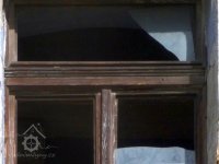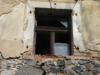 Skrz rozbité okno mlýnice je vidět část krovu.