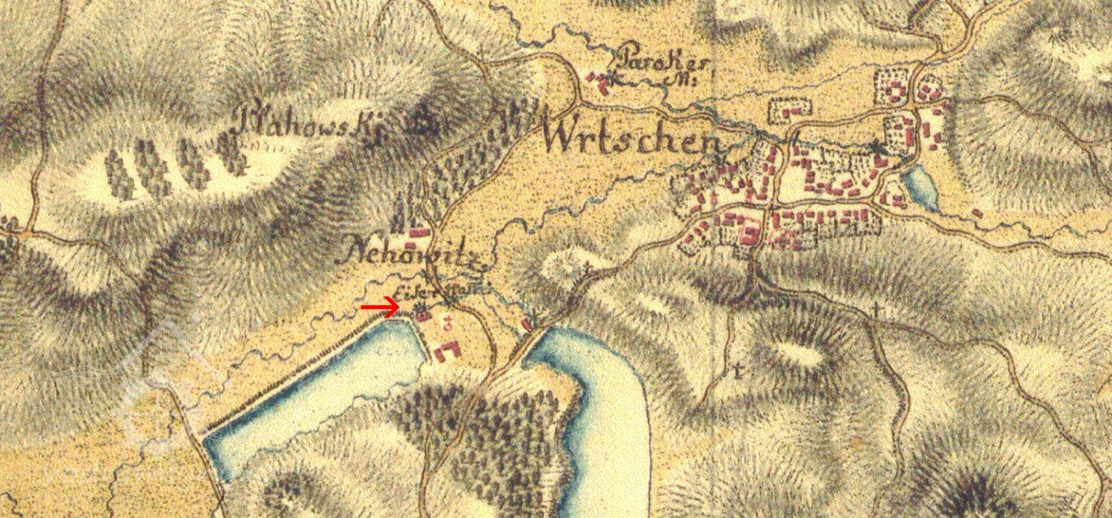 1) správní budova čp. 77 2) budova železáren, později mlýn 3) bývalá olejna se skladištěm 4) hospodářský objekt 5) ohrazení 6) koryto původního náhonu 7) zahrada Areál železářské huti stojí při severním okraji obce na východním břehu Panského rybníka, vlevo od silnice směrem do Vrčeně. Plocha areálu je zhruba obdélná, s delší osou probíhající ve směru sever-jih, na ní stojí objekty bývalé železárny: na jižní straně bývalá správní budova čp. 77 (1), severně od ní bývalá zahrada (7), za ní dále k severu navazuje objekt bývalé olejny se skladištěm (3) a severovýchodně od něj hospodářský objekt (4). Na severní straně areálu stojí budova bývalé železárny, později upravená na mlýn (2). Východně od býv. mlýna prochází dnes zatrubněný náhon (6) bývalé železárny. Areál je na západní straně k Panskému rybníku a na východní straně směrem ke komunikaci vymezen ohradní zdí (5), vyzděnou převážně ze struskových tvárnic.