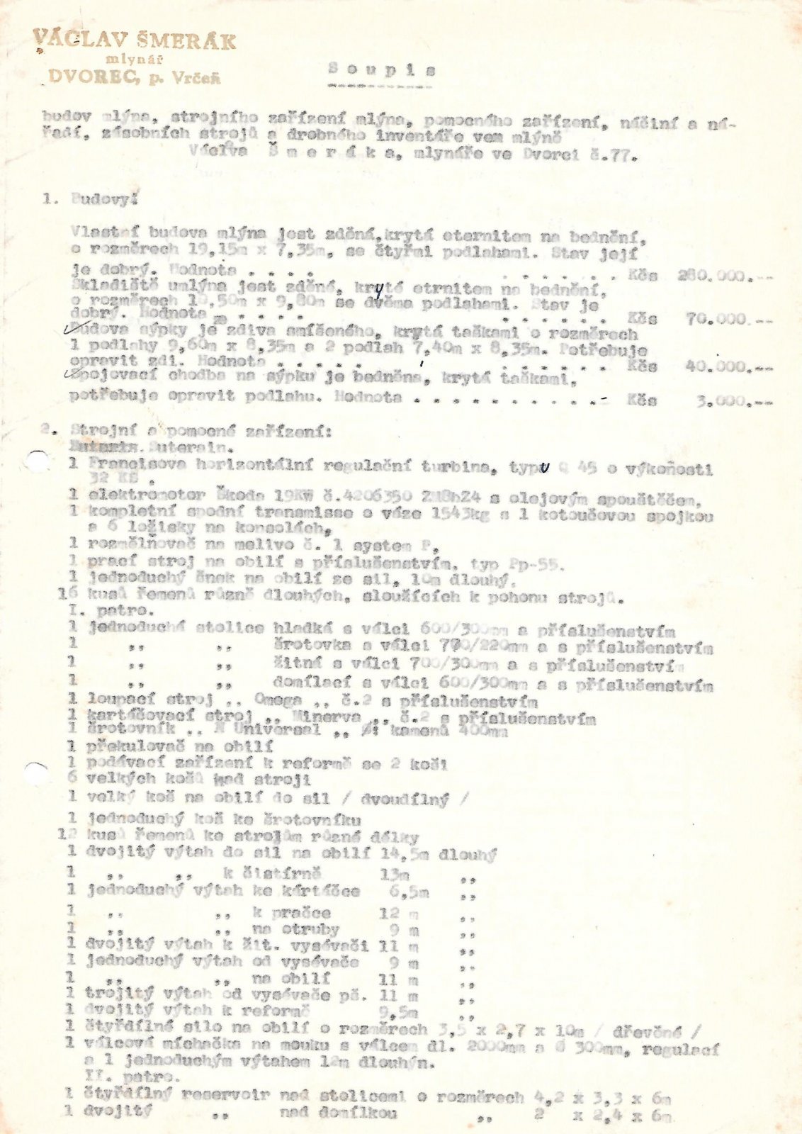 Historie železárenského areálu v Dvorci začíná pravděpodobně již na počátku 18. století, kdy byl zřízen rybník pro pohon kováren i hamrů a postupně vystavěn dům č. p. 77 a 78. Práce byly ukončeny před rokem 1900, později sloužil areál k výrobě řepkového oleje a roku 1920 vybudován mlýn Václava Šmeráka. Jižní část mlýna je již památkově chráněna, pod stavbou na st. p. č. 49/1 protéká původní, dnes do podzemí svedený náhon. Na jižní část navazuje severní, rozsáhlejší budova na půdorysu písmene L, o jejíž více než dvousetleté historii svědčí pozůstatky barokně-klasicistního členění fasády. Právě budova dnešního mlýna tvořila centrum železáren. Ta je dnes poznamenána stavebními úpravami především ze 70. let 20. století. V jádru však uchovává původní, historickou budovu. Areál dále tvoří bývalá olejna, jejíž severní přízemní část je částečně zapuštěna do terénu, jižní část tvoří tři nadzemní podlaží s podkrovím, atypické je využití hrázdění. Na východním okraji areálu nalezneme hospodářský objekt z tradičního místního stavebního materiálu struskových tvárnic, pravděpodobně z počátku 20. století. Z tvárnice je postavena také ohradní zeď.