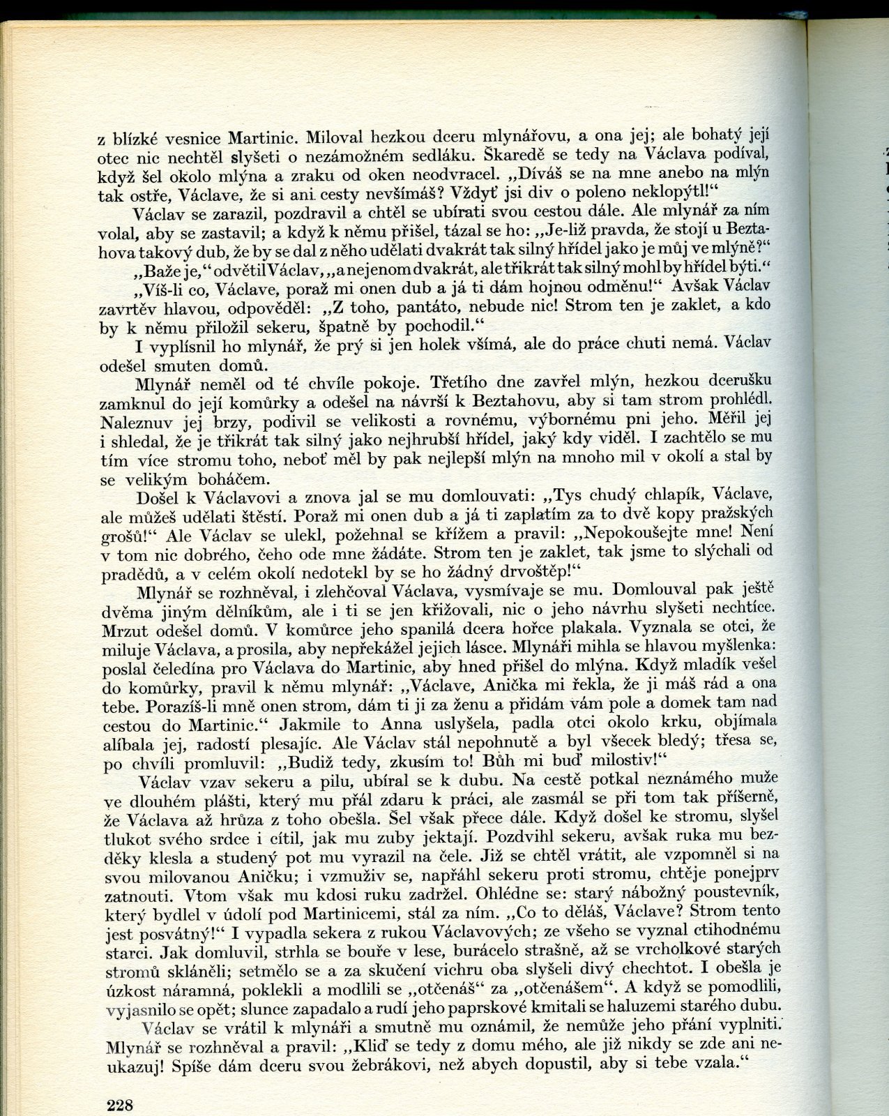 Václav vzav sekeru a pilu, ubíral se k dubu. Na cestě potkal neznámého muže ve dlouhém plásti, který mu přál zdaru k práci, ale zasmál se při tom tak příšerné, že Václava až hruza z toho obešla. Sel však přece dále. Když došel ke stromu, slyšel tlukot svého srdce i eitil, jak mu zuby jektají. Pozdvihl sekeru, avšak ruka mu bez diky klesla a studený pot mu vyrazil na tele. Již se chtěl vrátit, ale vzpomněl si na svou milovanou Aničku; i vzmuživ se, napřáhl sekeru proti stromu, chtěje ponejprv zatnouti. Vtom však mu kdosi ruku zadržel. Ohlédne se: starý nábožný poustevnik, ktery bydlel v údoli pod Martinicemi, stál za ním. „Co to dělá, Václave? Strom tento jest posvátny!" I vypadla sekera z rukou Václavových; ze všeho se vyznal ctihodnému starci. Jak domluvil, strhla se bouře v lese, burácelo strašně, až se vrcholkové starých stromů skláněli; setmělo se a za skučení vichru oba slyšeli divý chechtot. I obešla je uzkost náramná, poklekli a modlili se „otčenáš“ za otčenášem". A když se pomodlili, vyjasnilo se opet; slunce zapadalo a rudi jeho paprskové kmitali se haluzemi starého dubu.