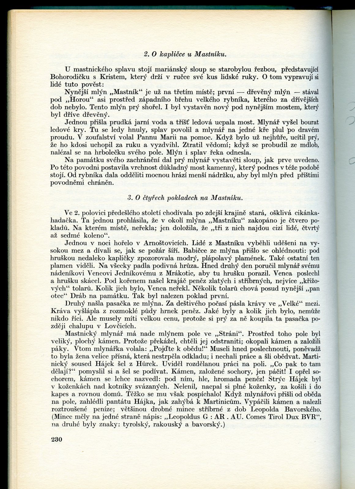 Jednou v noci hořelo v Arnoštovicích. Lidé z Mastníku vyběhli uděšeni na vysokou mes a divali se, jak se pokhr Sit. Babičce ze mlyna prišlo se ohlédnouti pod hruškou nedaleko kapličky zpozorovala modrý, plápolavý plamének. Také ostatní ten plamen videli. Na všecky padla podivná hrůza. Hned druhý den poručil mlynát svému nádenikovi Vencovi Jednikovému z Mrákotic, aby tu hrušku porazil. Venca poslechl a hrušku skaeel. Pod kořenem našel krajáě peněz zlatych i stribrnych, nejvíce kliko vych" tolarů. Kolik jich bylo, Venca neřekl. Několik tolaru chová posud nynější ..pan otee" Dráb na památku. Tak byl nalezen poklad první.
