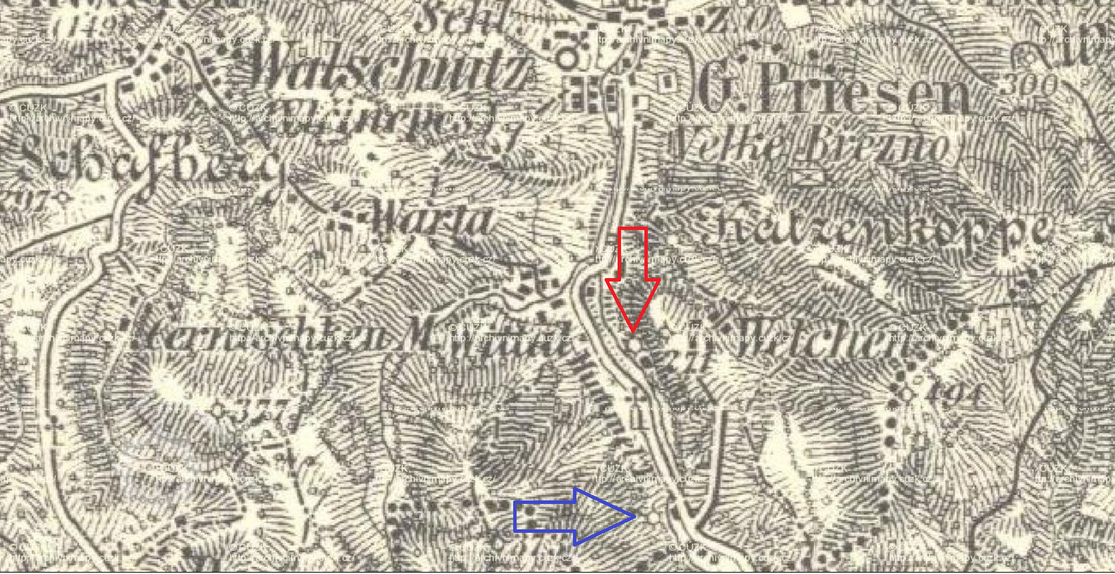 Novější mlýn s pilou, existoval pouze 100 let, po roce 1945 zanikl, zachovány jen základy.