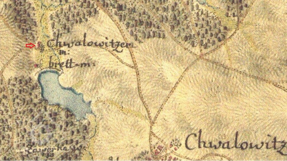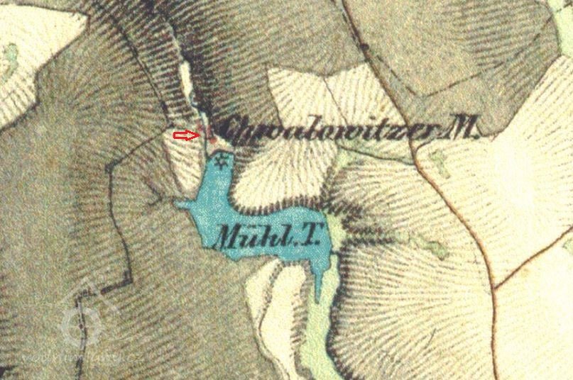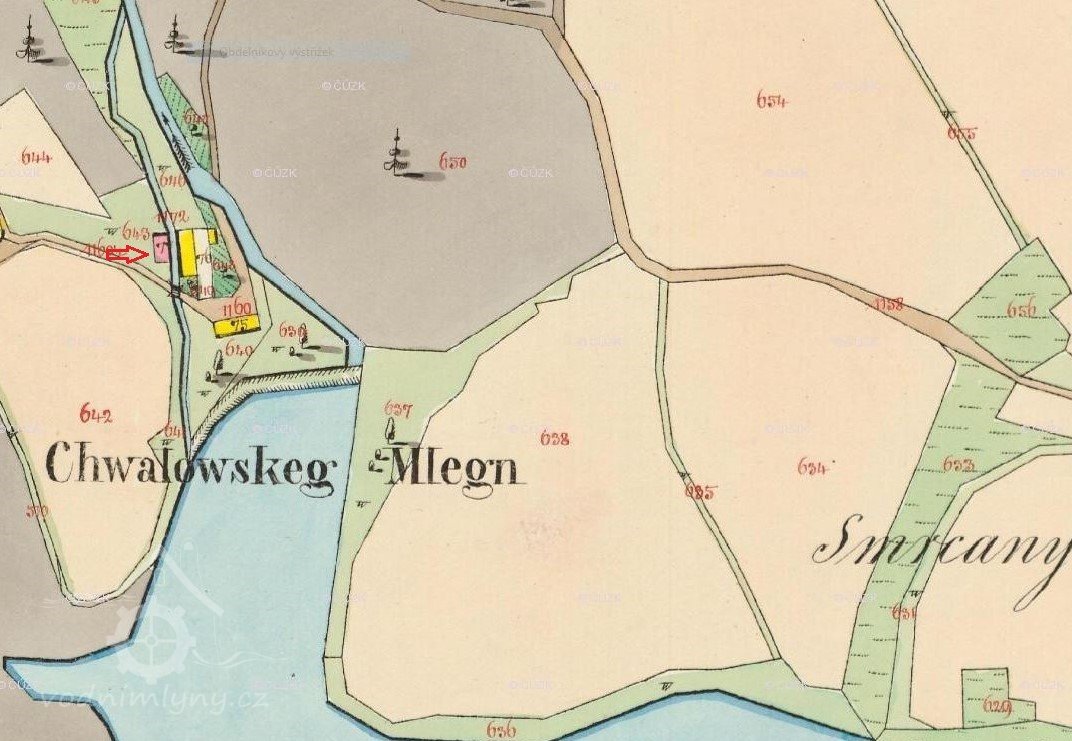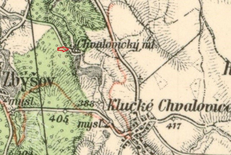 Rybník part. číslo 511 vel. 11 jiter, 1245 sáhů v katastrální obci chvalovické jest a ostane vlastnictvím panství Kluk - Chvalovického a toto panství bude jak dosavad povinno c. k. daně z tohoto rybníka vybývati a hráze pak velký a malý splav na tom samém na vlastní náklad v dobrém stavu vydržovati. Stran využívání vody v tomto rybníce vyhrazuje sobě jmenované panství vtom samém ryby chovati ty samé dle obyčejných zásad hospodářských loviti, - nemá se ale rybník k tomuto účelu vícekráte než ve třech letech jednou spustit a má vždy nejméně 14 dní před lovem držitel mlýna dorozuměni býti, aby mohl v tom čase ještě v rybníce se vynacházející vodu upotřebiti. Po skončení lovu má rybník zase bez prodlení zatopen býti. Stranu vyvážení náplavy zachování sobě jmenovaného panství právo jednou v 6 letech, a sice jen zimního času z toho rybníka náplav nebo bláto vyvážeti, naproti tomu jest a bude držitel mlýna čís. 56 v Chvalovicích oprávněn vodu z toho rybníka malým splávkem do mlýnské struhy a z té samé na jeho mlýn vésti. Čištěním této strouhy, vydržování vantrok má budování držitel mlýna vlastním nákladem obstarávati.