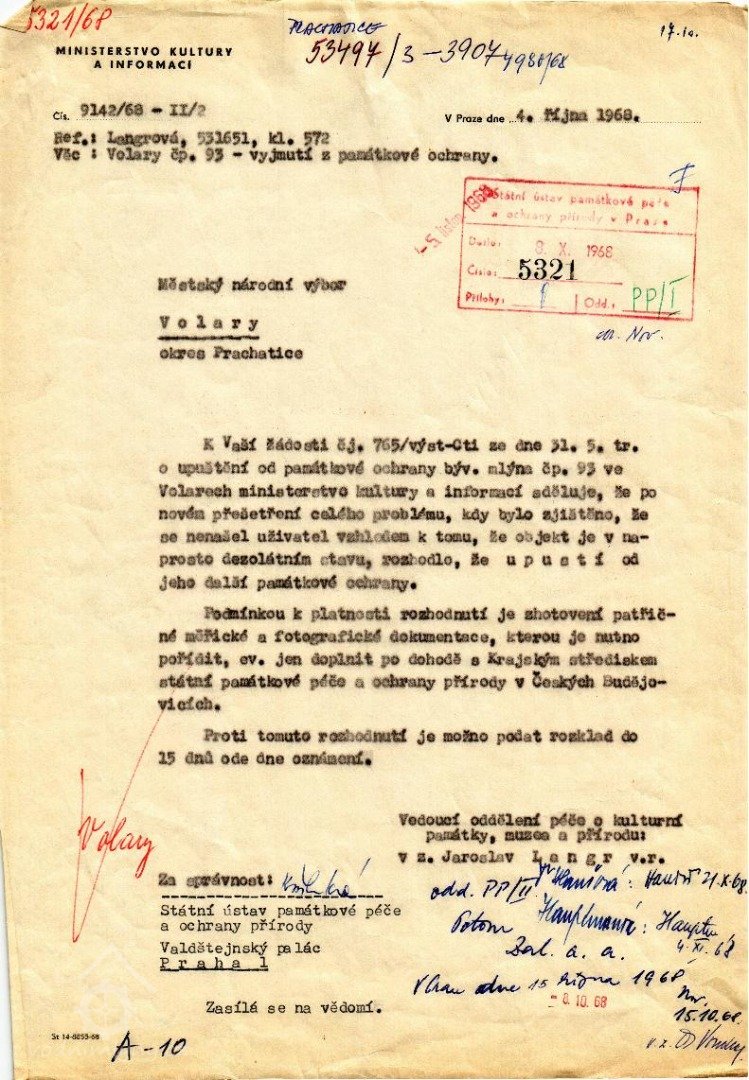 Objekt násilně demolován dle zjištění KPS, na žádost MěNV se upouští od ochrany čj. 3250/68 dne 4. 10. 68.