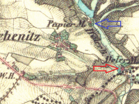 900 m východně od kapličky v Řehenicích, 1 km severně od kapličky v Nespekách