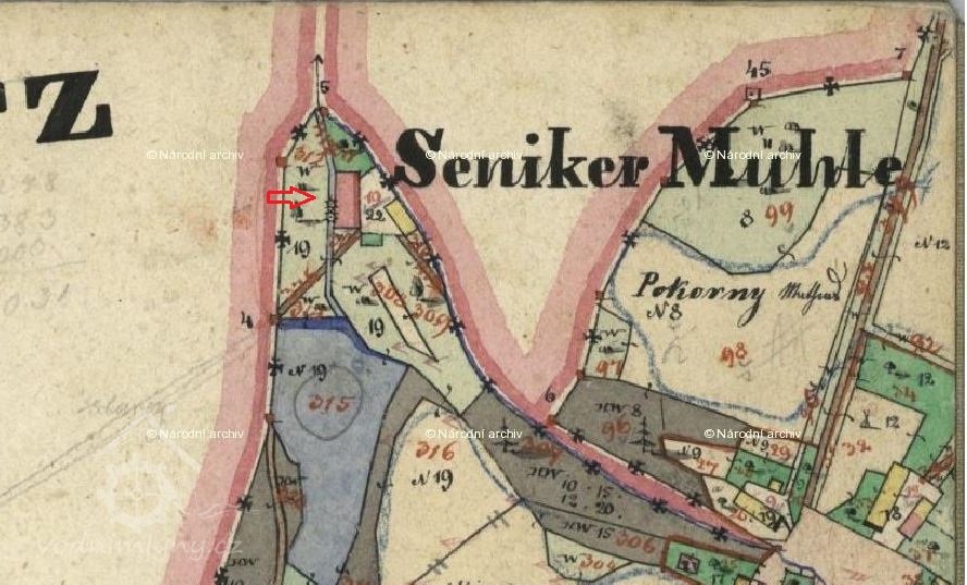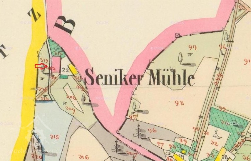 Nad mlýnem je rybník, kterým protéká Senický potok. Z rybníka tekla voda stavidlem ke mlýnu na mlýnské kolo.