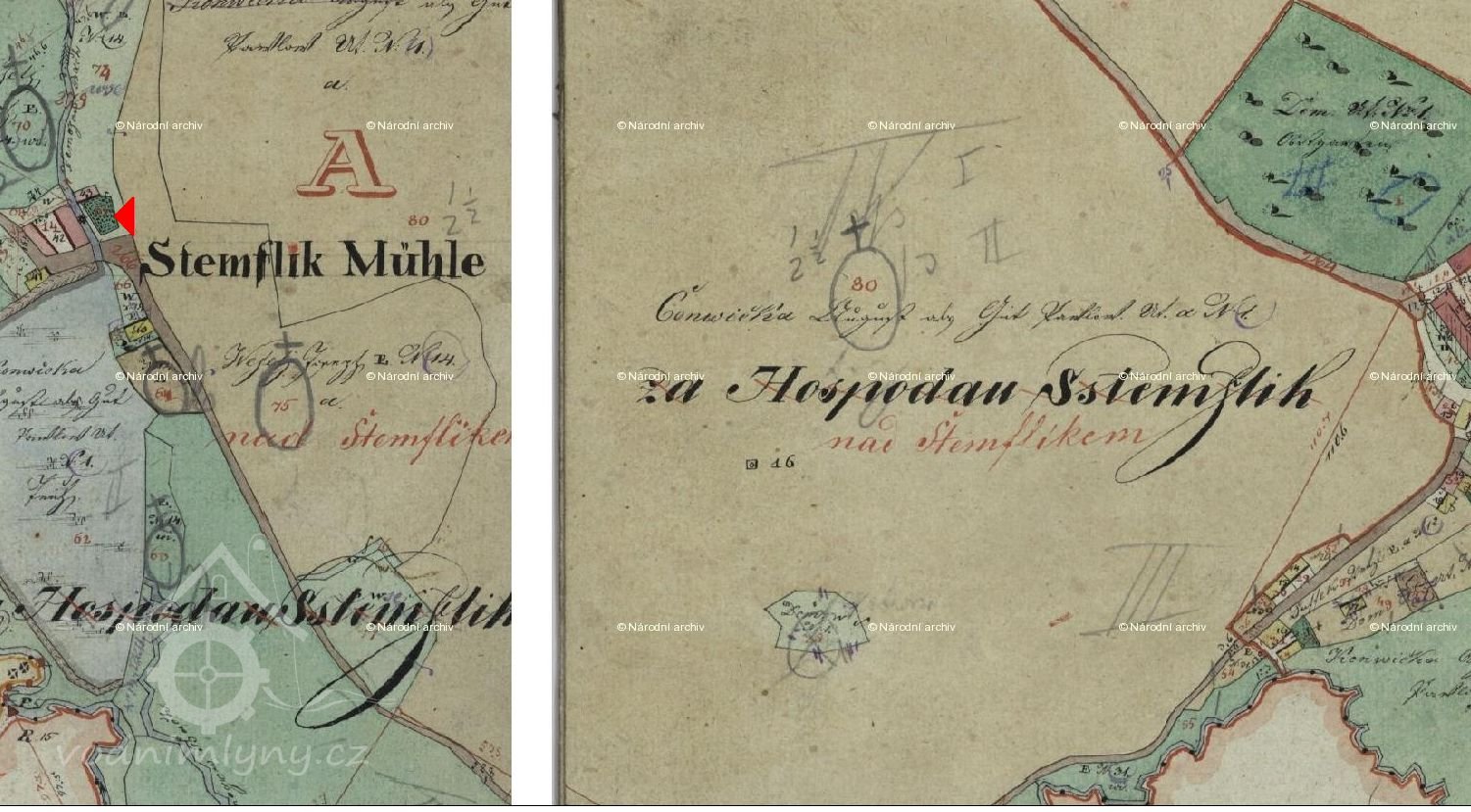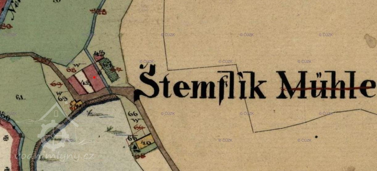 Protokol z 29.4.1930 – schválení vodního díla v katastru Pavlova „...vodní dílo „Štemflík“ čp.14 s vodní nadržkou u Štemflíka č.kat. 62“. Vodní dílo se již delší dobu nepoužívá, mlýn zrušen, vodní kola odstraněna, zůstaly pouze 3 žlaby na vodní kola. Vlastník Václav Donát majitel velkostatku v Pavlově.