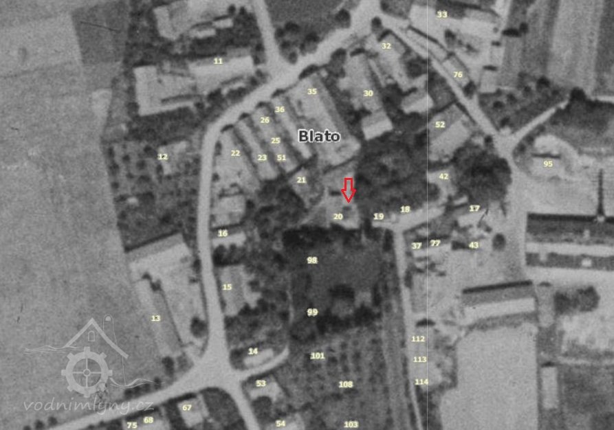 Budova bývalého mlýna se nachází ve středu obce Blato, v minulosti byl přímo nad mlýnem rybník.