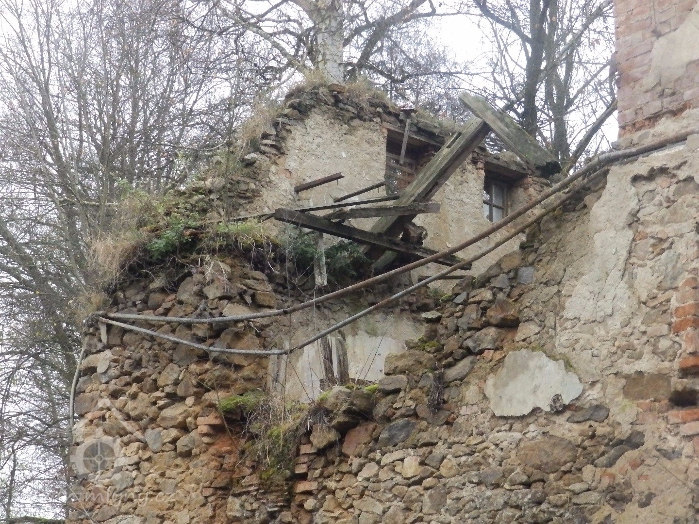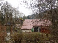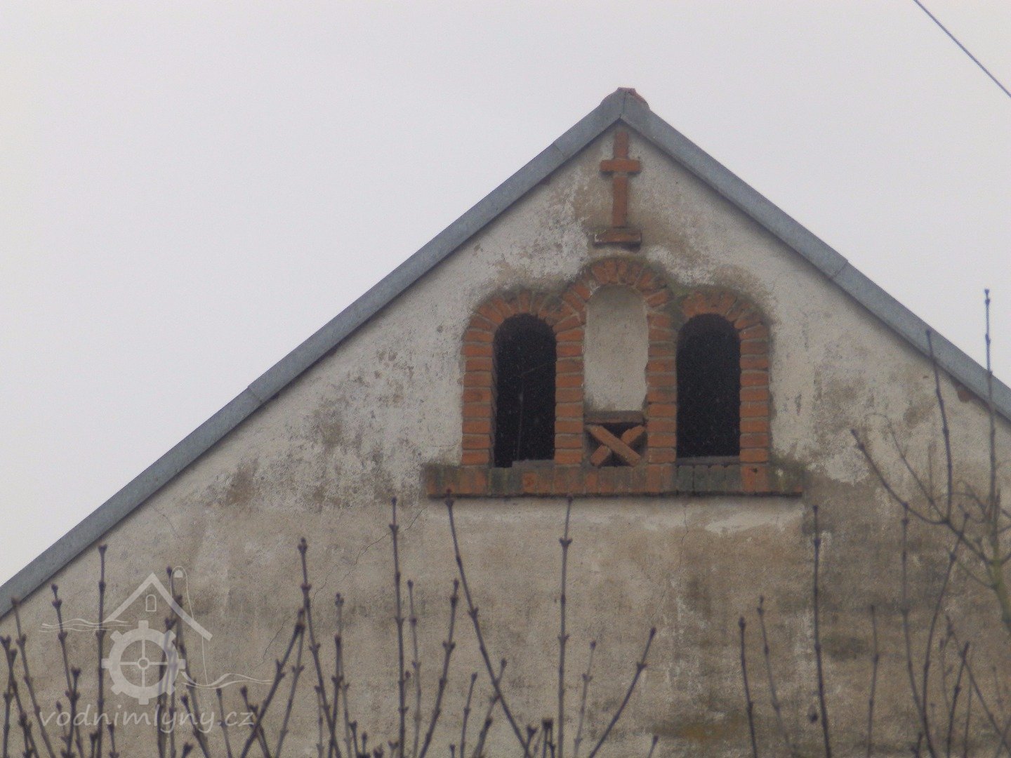 V otevřeném patře zpustlé mlýnice patrné zbytky kapsových výtahů