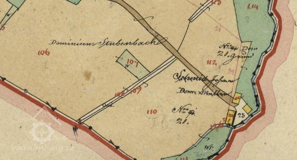 Majitelem mlýna v roce 1930 byl Jan Bauer, při mlýnu se uvádí cirkulárka. ( V seznamu vodních děl je poloha mlýna čp. 21 nepochybně zaměněna s usedlostí čp. 148 v katastru Dolní Zelené Hory, jestli jsou technické údaje přiřazeny správně není jisté ) Dolní tok Plavebního potoka se  nazývá Sekerský.