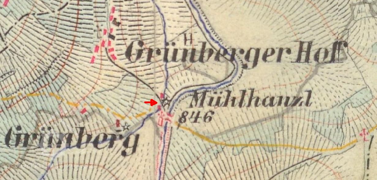 Původně mlýn na křemen, sloužící pro potřeby blízké huti, původně spadající do katastru Prášil.