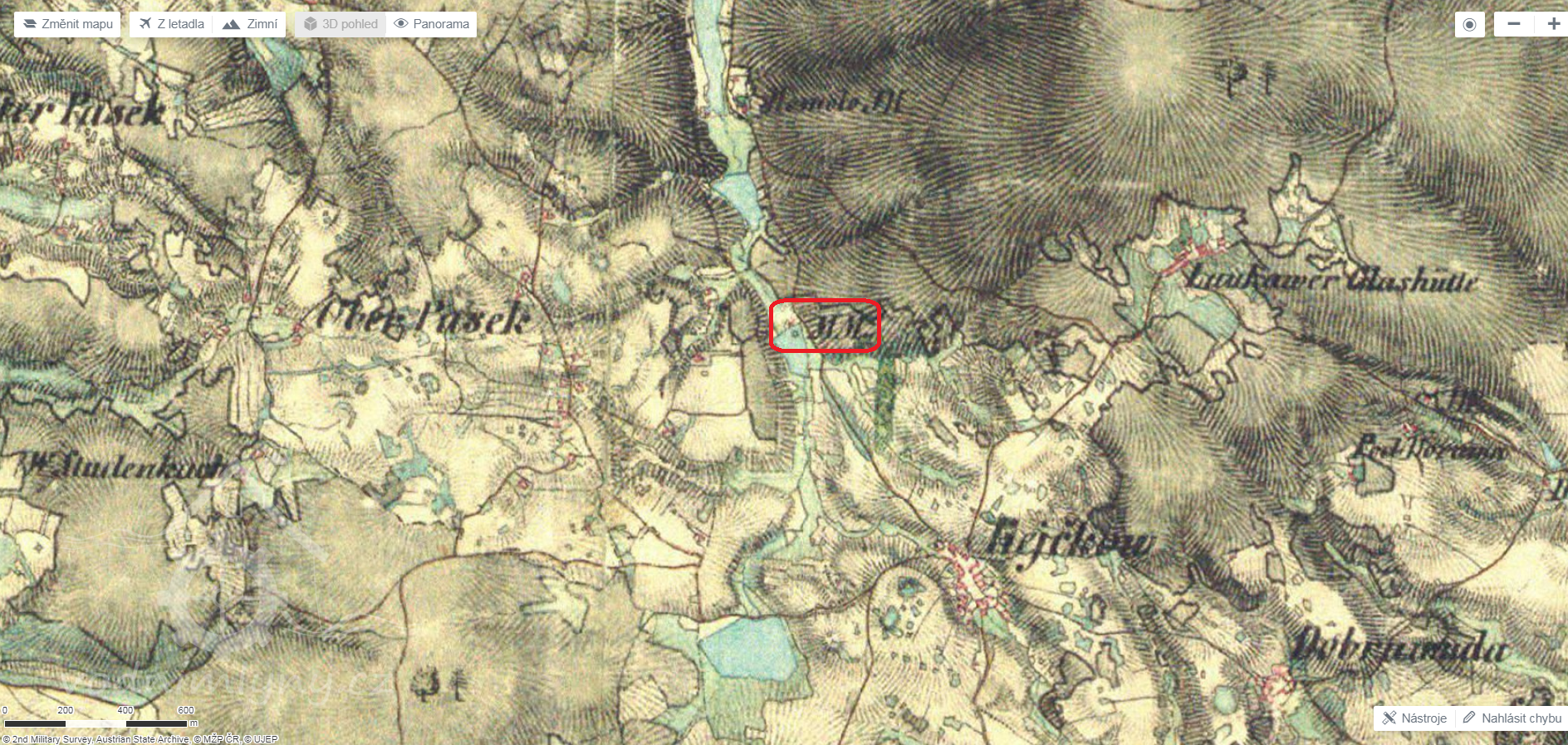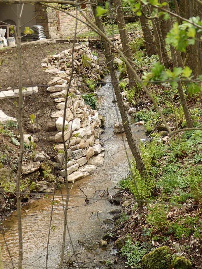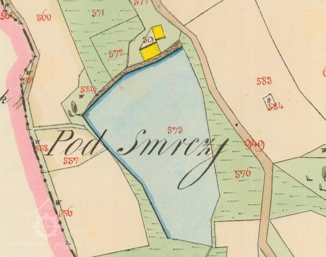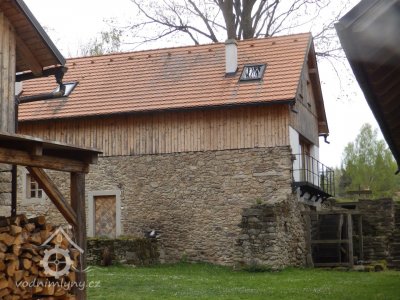 Pěkně opravený mlýn na samotě pod rybníkem severně od Rejčkova.