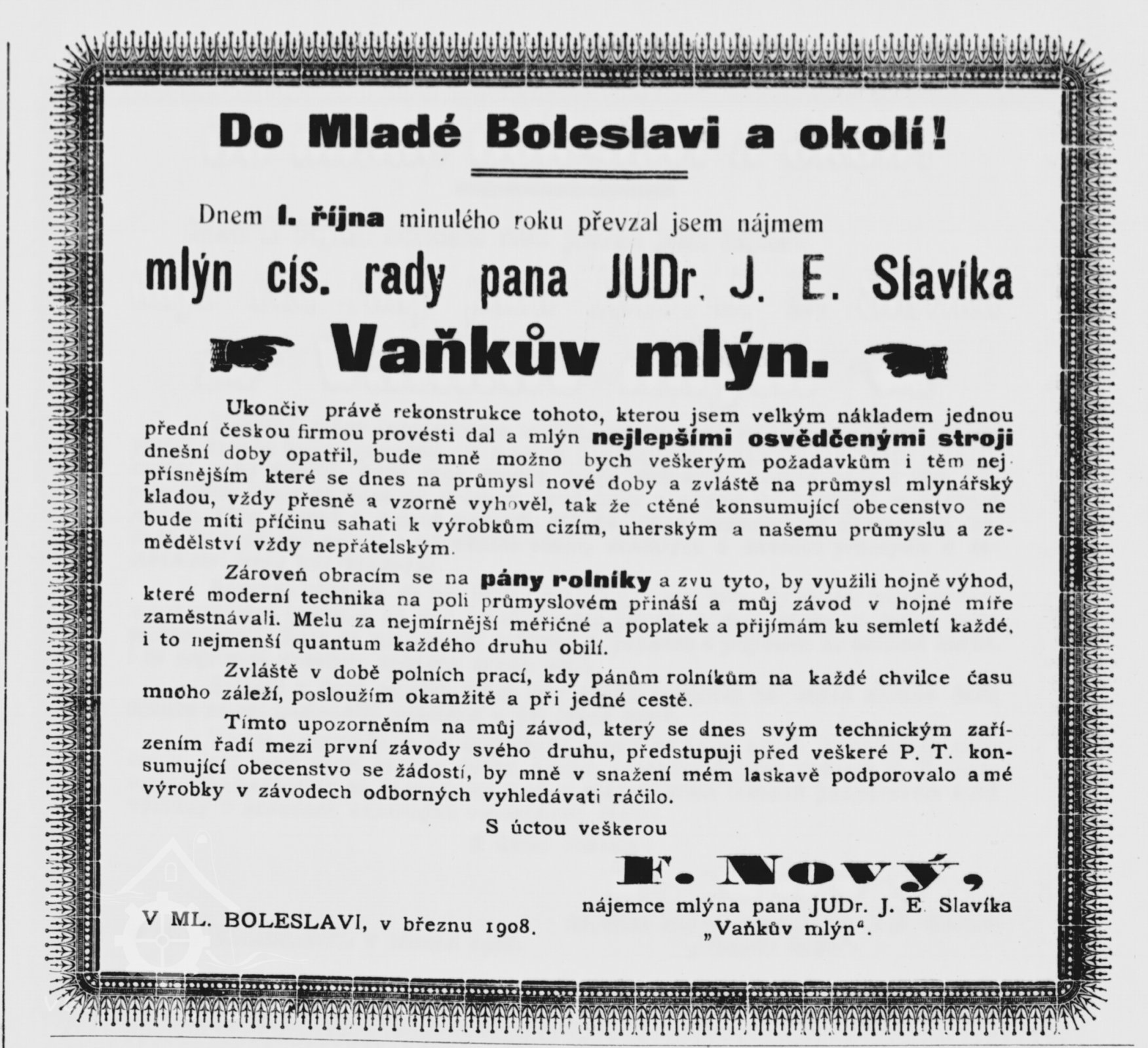 1787 nájemce Matěj Vodvářka, mlýn o 5 složeních vyhořel, znovu vystavěn a obec vyhlásila licitaci na jeho prodej do dědičného nájmu. V licitaci zvítězil Matěj Vodvářka za 4.000 zl., roční nájemné 707 zl. Ke mlýnu patřilo žitné pole Na Vandrovce na 4 str. výsevku.