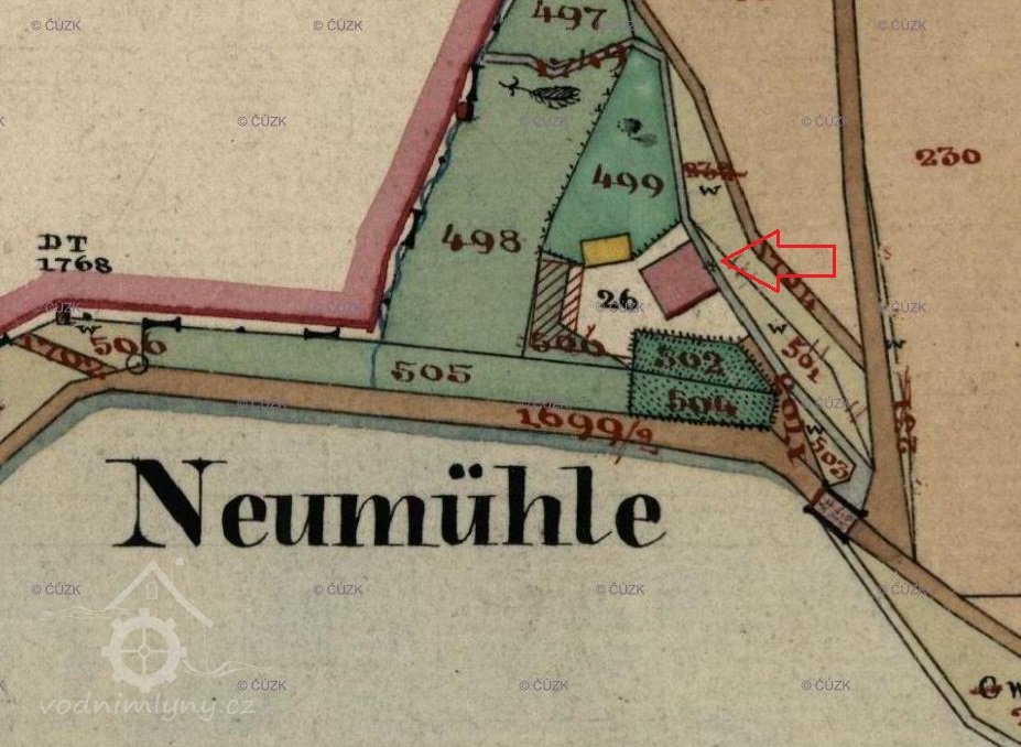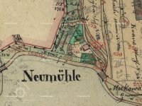 Rok 1736 – v matrice se poprvé objevuje název Neumühl Messhals, mlynář Johann Rautschka s manželkou Dorotheou, záznam o narození jejich syna Josepha v červenci 1736, listopad 1737 syn Norbert, březen 1739 syn Johannes, duben 1742 syn Benedict.