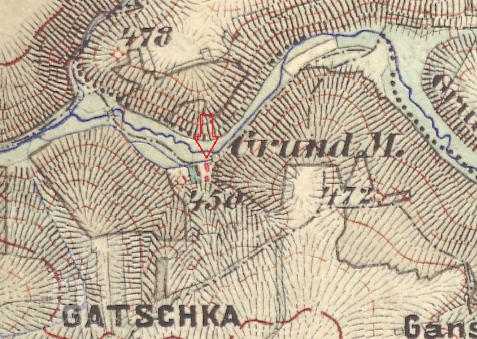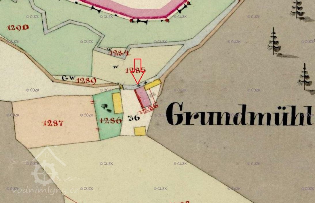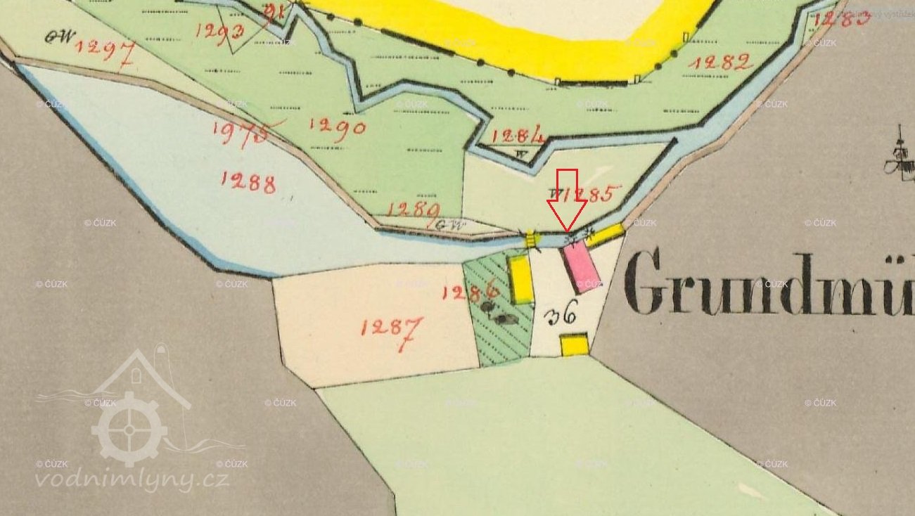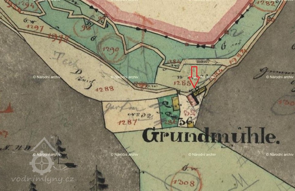V matrikách se poprvé zápis Grundmühl objevuje od roku 1698. Tereziánský katastr zaznamenal k roku 1714 mlynáře na zakoupeném panském mlýně  o dvou kolech na nestálé vodě.