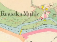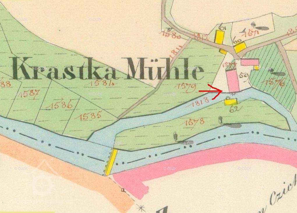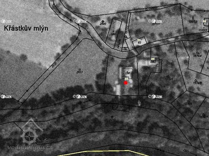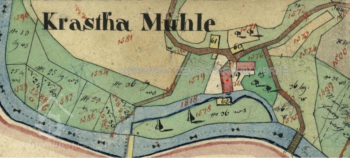 Křástkův mlýn, dříve Otrobův, je zobrazen na I.a II.vojenském mapování a na císařském otisku z r. 1835. Vodní tok - řeka Jihlava - je zde rozdvojena a k mlýnu putuje užší tok, tzv. mlýnský potok. U mlýna se nacházela vodní nádrž o rozměrech 6,8 m krát 5,7 metru pro vodu, svedenou z řeky a ta využívala 3 stavidla.