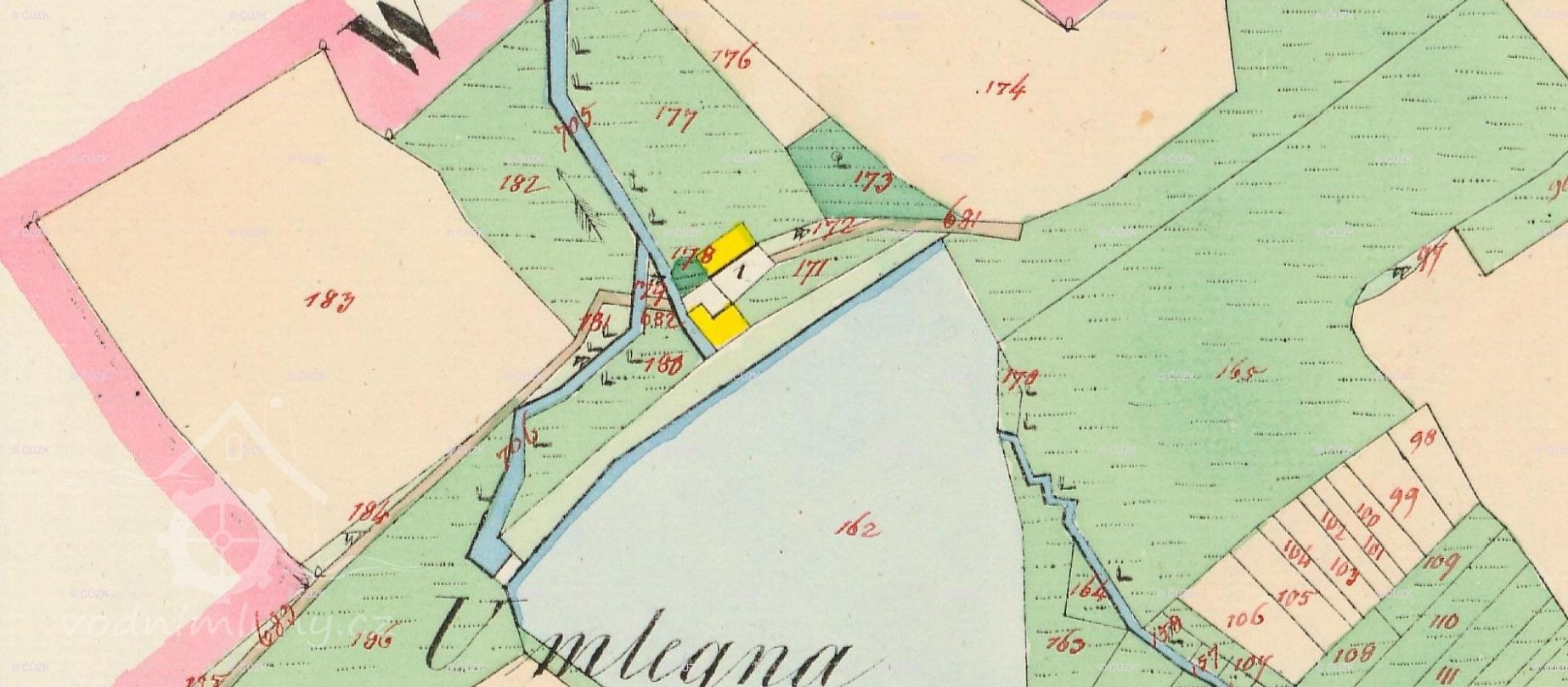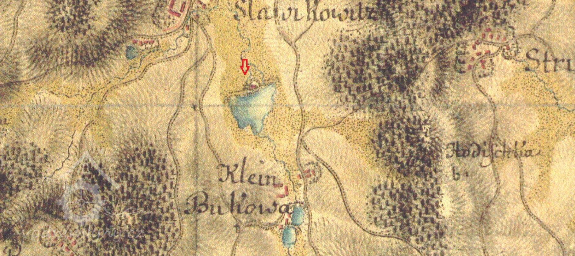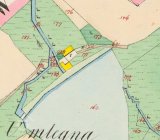 Indikační skica a otisk stabilního katastru v roce 1837 zaznamenávají na samotě severozápadně nad Bukovou spalnou budovu ve tvaru písmene L s jedním kolem pod hrází rybníka, naproti mlýnu je další spalná obdélníková budova. Majitelem je Josef Lang. Lokalita se jmenuje U Mlejna.