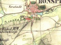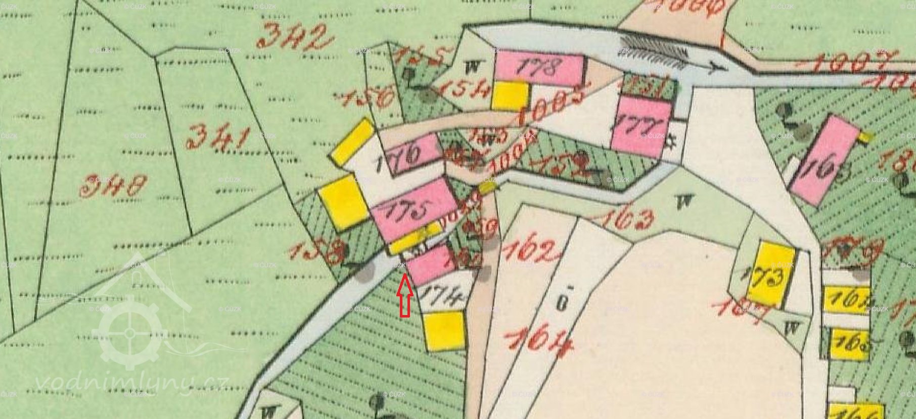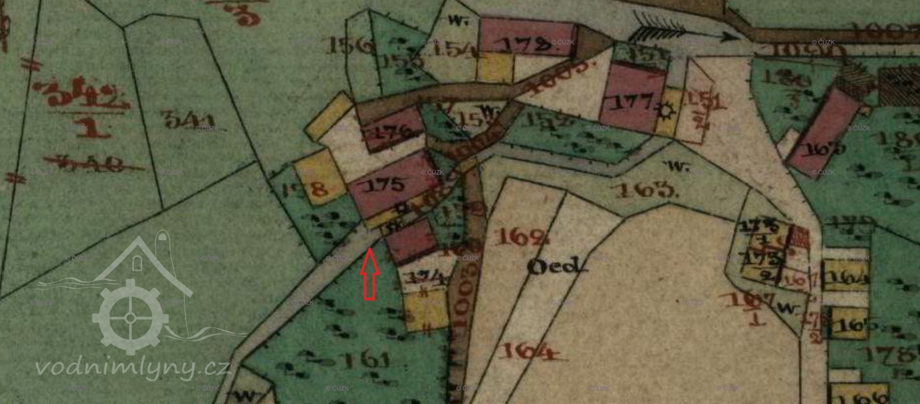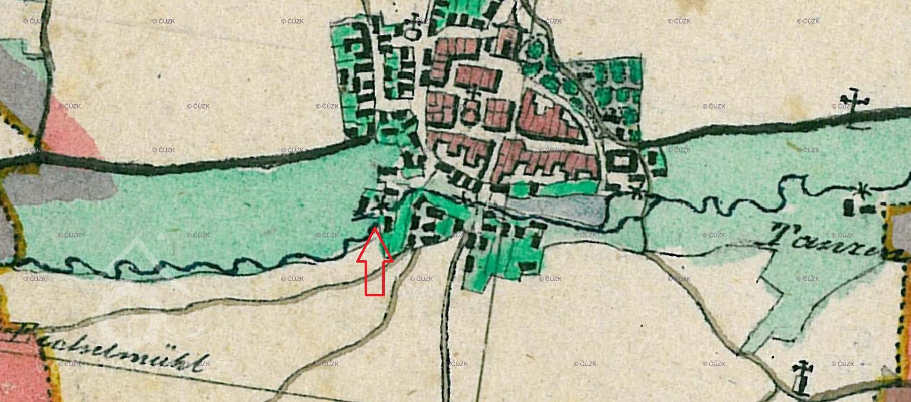 Indikační skica, originální mapa a otisk stabilního katastru 1838 – obdélníková nespalná budova s dřevěným přístavkem s jedním kolem, hned za druhé straně potoka menší spalná budova také s dřevěným přístavkem s jedním kolem. Majitelem je Franz Friedl. J. G. Sommer zmiňuje v Poběžovicích k roku 1839 mj. panský pivovar na 20 sudů, lihovar, papírnu, kovárnu, 3 mlýny a 2 mlýny na kroupy.