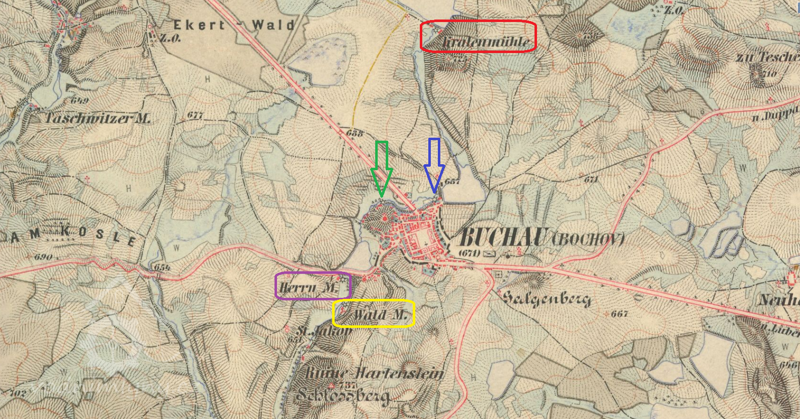 Mlýn s pilou na západním okraji Bochova. Autoři knihy Tajemství řeky Střely tento mlýn ztotožňují s Panským mlýnem (Herrnmühle), ten však ležel níže po proudu.