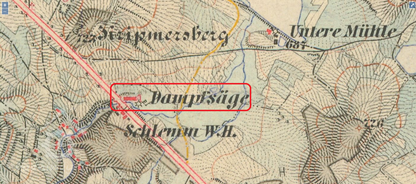 Mlýn s pilou založený v 2. pol. 19. stol. na mapě III. vojenského mapování jako parní pila, 1930 registrován opět jako vodní. Dnes zpustlý a zchátralý, střecha uprostřed propadlá.