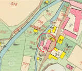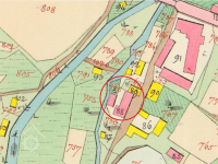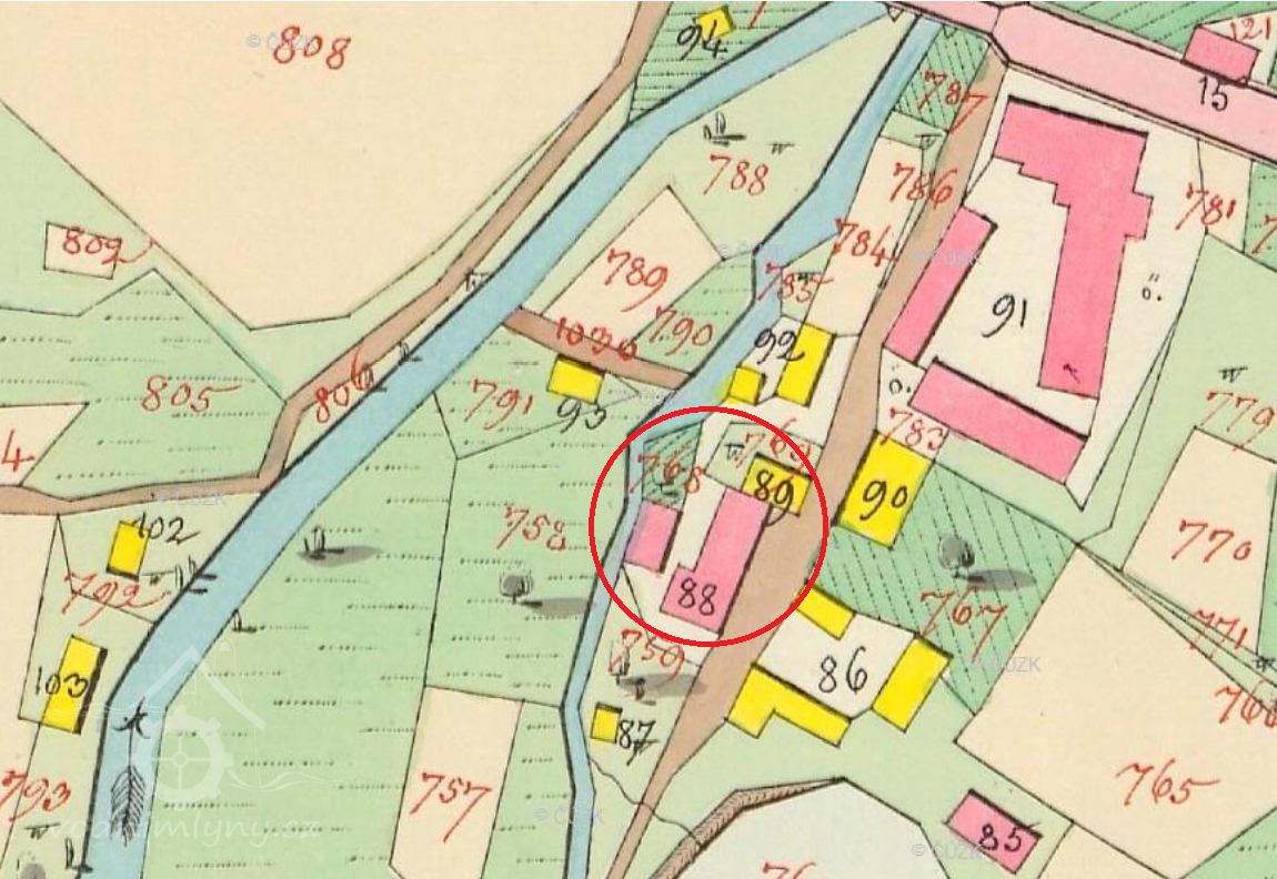 mlýnkem, neb je zobrazena přímo při mlýnském náhonu. Je pravděpodobné, větší objekt vystřídal tento mlýnek a výklenek na jeho jihozápadní straně mohl sloužit pro umístění vodního kola.
