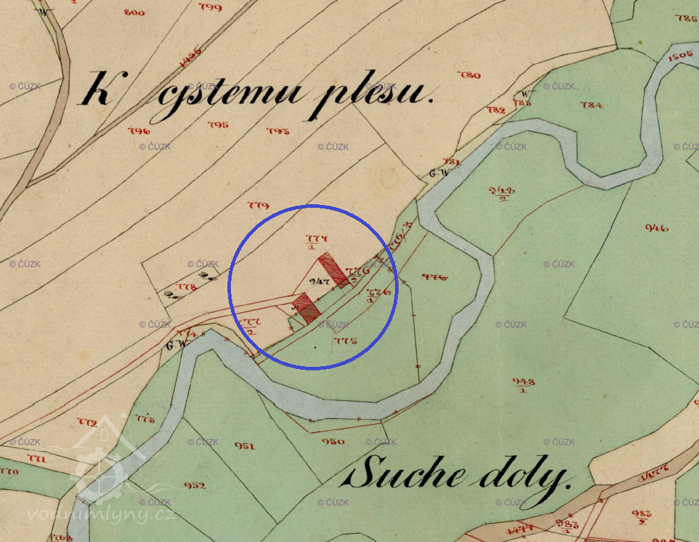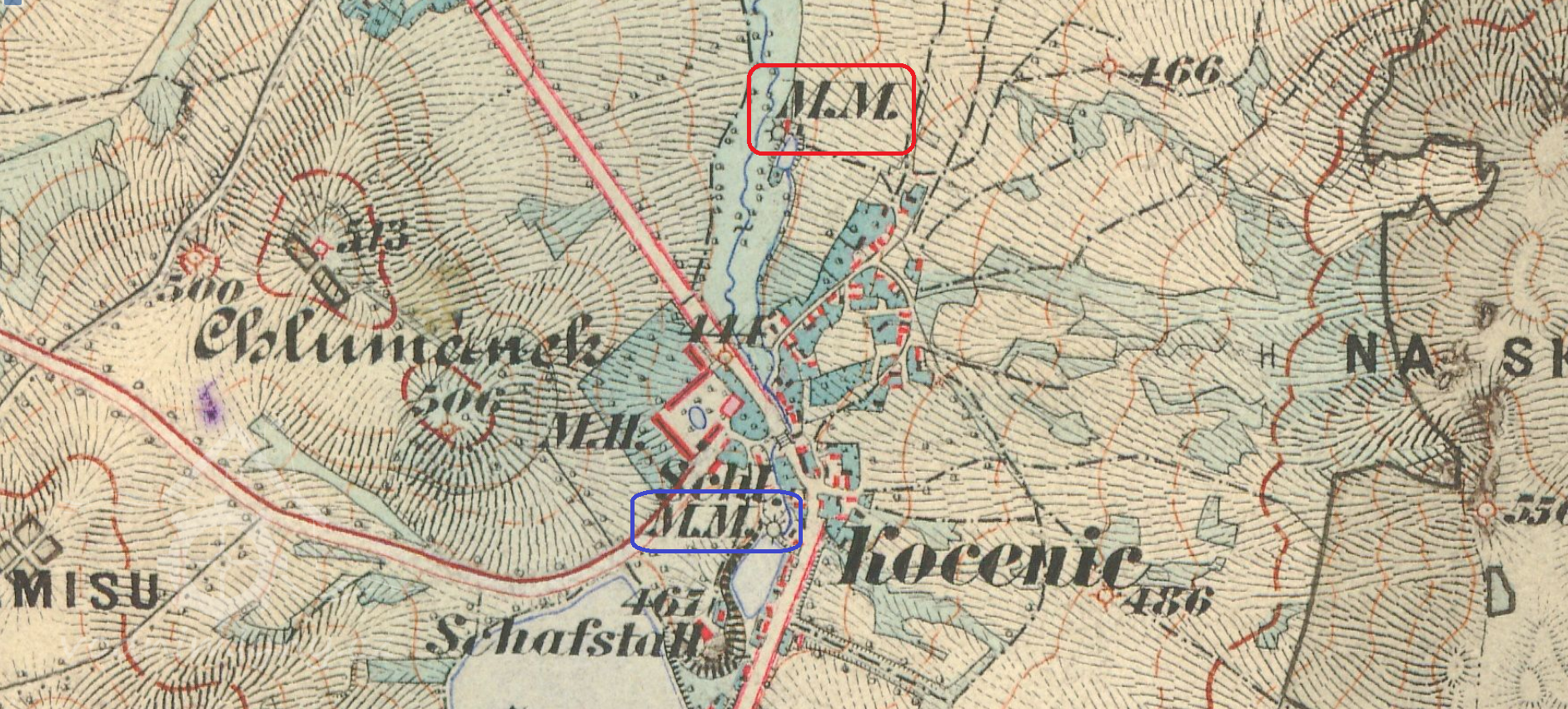 Dolní (červeně) a Chocenický (modře) mlýn, III. vojenské mapování, výřez, 1877-1880, © oldmaps.geolab.cz