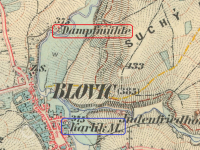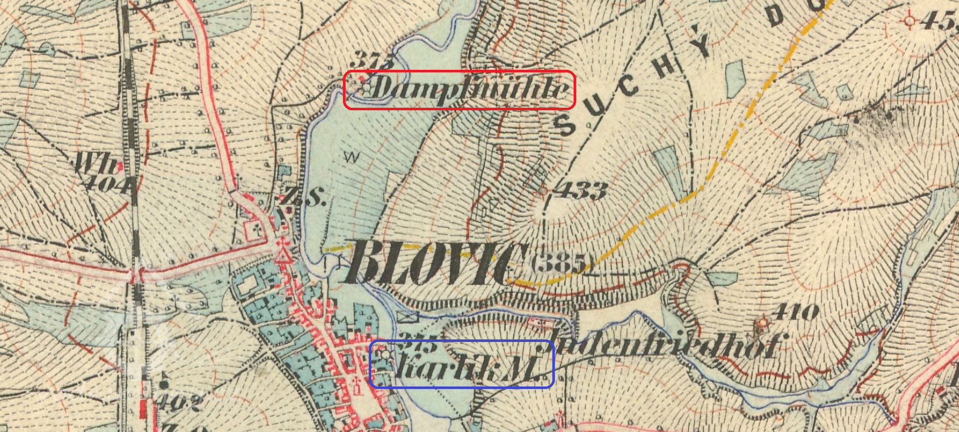 Okrouhlík (červeně) a Brodský mlýn (modře), III. vojenské mapování, výřez, 1877-1881, © oldmaps.geolab.cz