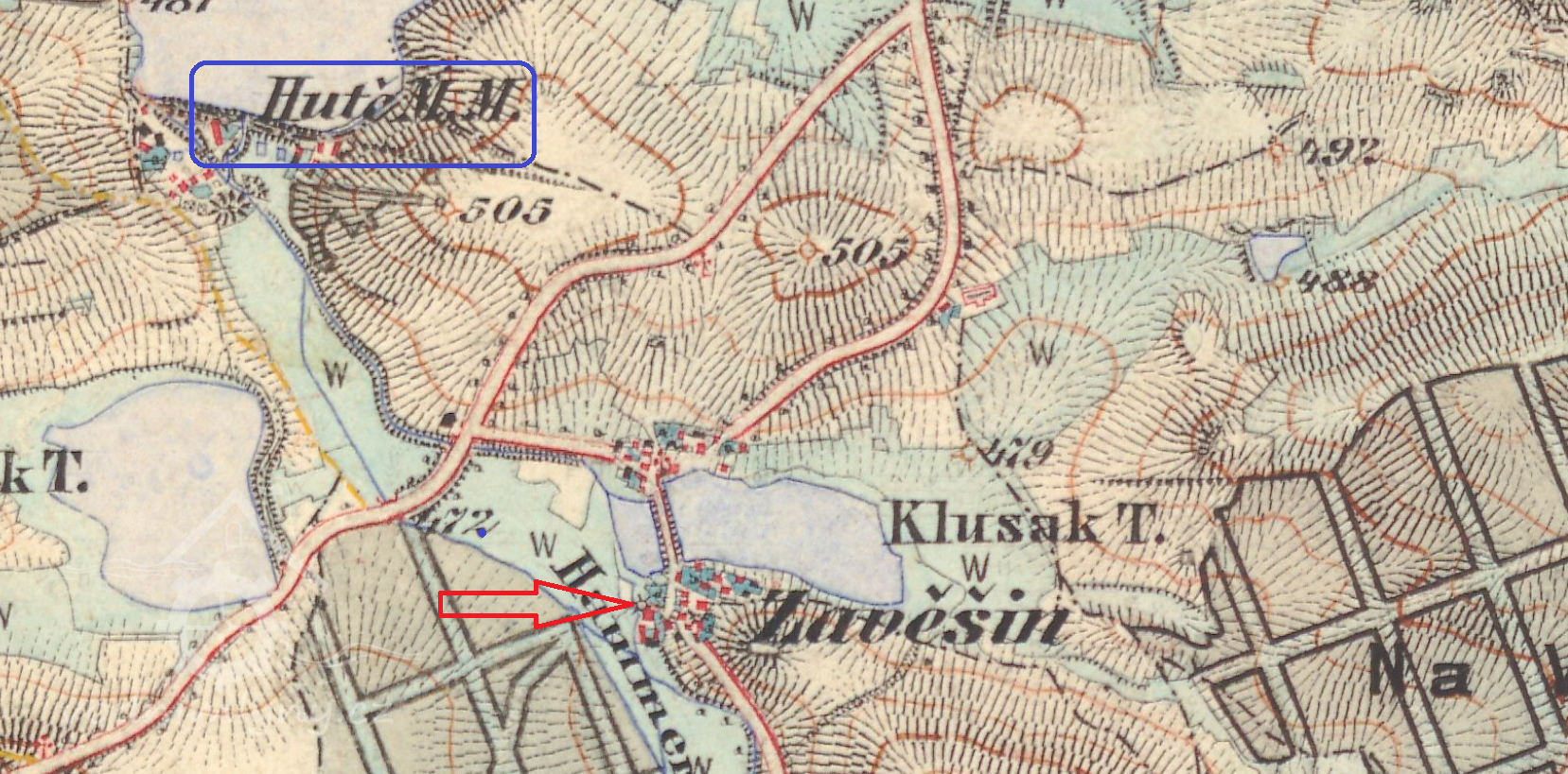 Alšův (červeně) a Huťský (modře) mlýn v Závišíně, III. vojenské mapování, výřez, 1877-1880, © oldmaps.geolab.cz