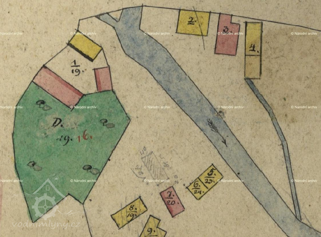 Tisovský (červeně), Horní (modře), Prostřední (zeleně) a Dolní (fialově) mlýn. I. vojenské mapování, výřez, 1764-1768, © oldmaps.geolab.cz