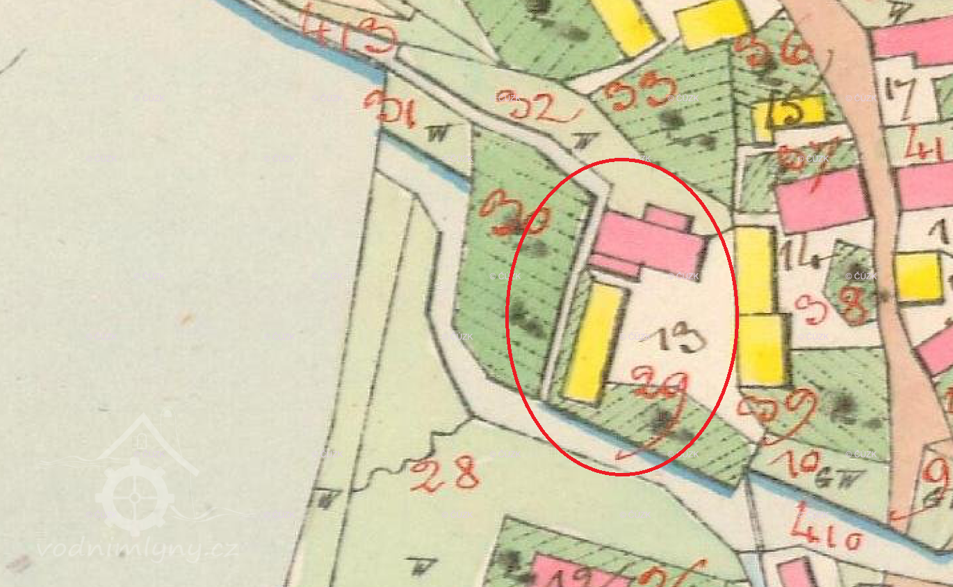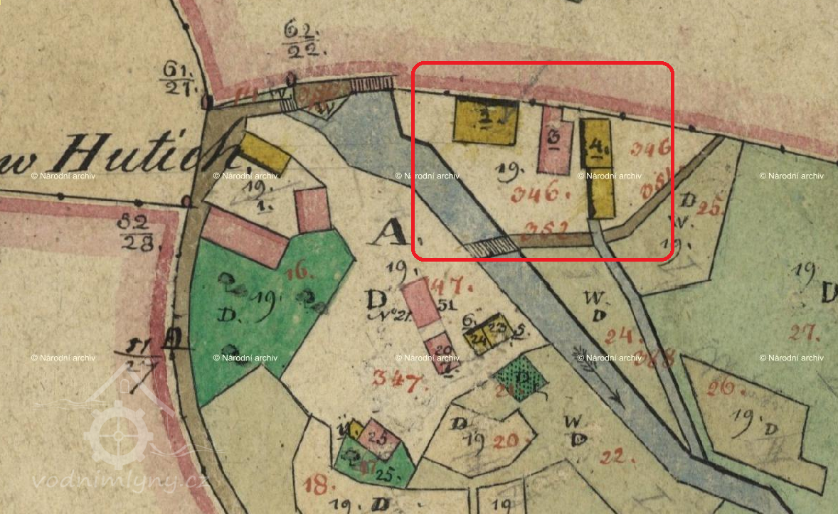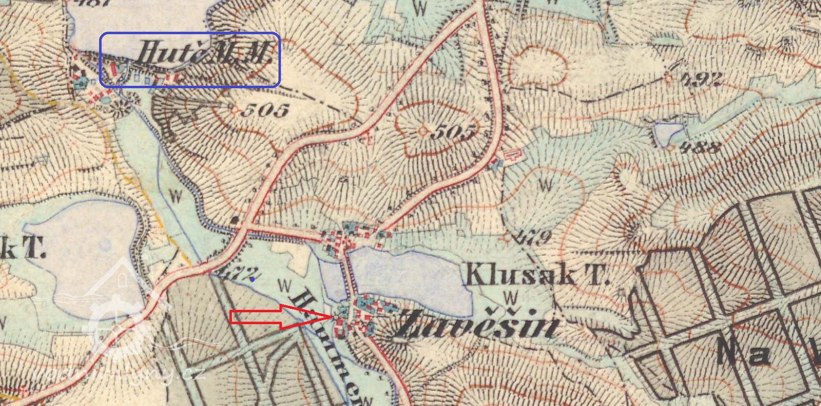 Alšův (červeně) a Huťský (modře) mlýn v Závišíně, III. vojenské mapování, výřez, 1877-1880, © oldmaps.geolab.cz