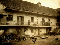 Rodina Františka Uhlíře před mlýnskou usedlostí, v pozadí budova mlýna, 1952 - 1953, © zdroj Z. Procházka: Cestami krajánků....., díl III