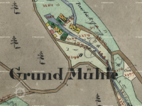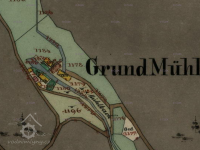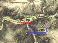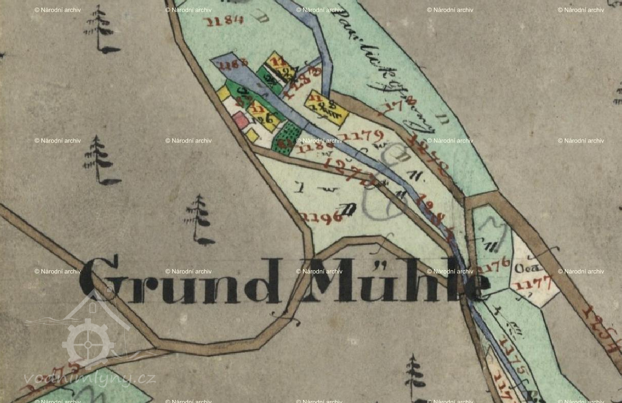 Nový (červeně) a Grundský (modře) mlýn, II. vojenské mapování, výřez, 1836-1852, © oldmaps.geolab.cz