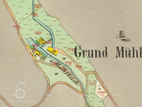 Nový (červeně) a Grundský (modře) mlýn, III. vojenské mapování, výřez, 1877-1880, © oldmaps.geolab.cz