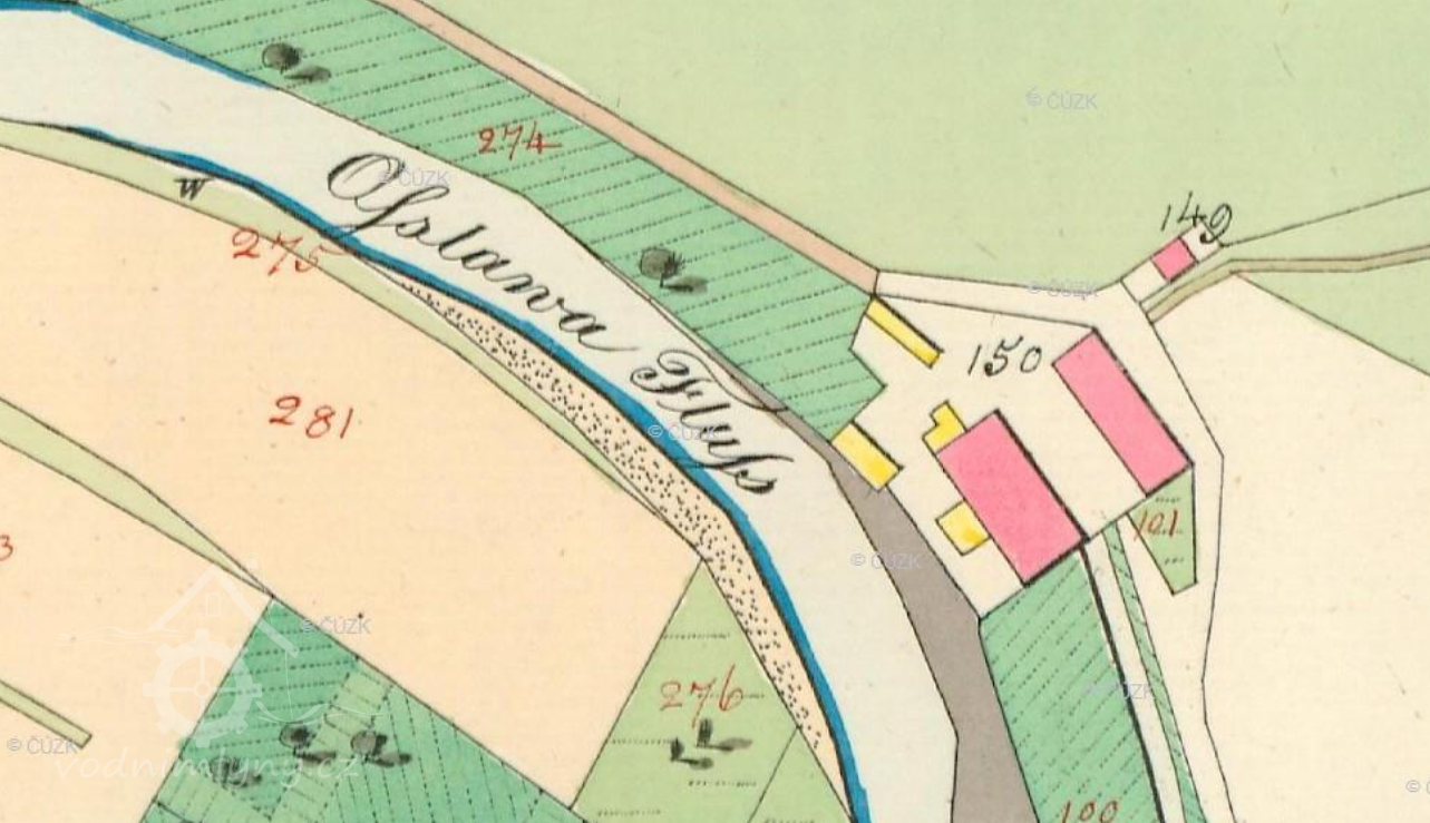 Pro svoji potřebu si továrna na poč. 19. stol. vybudovala z luk vedle splavu rozsáhlou vodní nádrž, ze které se voda vypouštěla do nadjezí, zdrojem byla vodoteč z rybníka Rathanu. Z nádrže je dnes patrná pouze obtoková strouha na pravém břehu Oslavy.