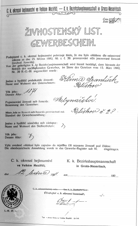 31.12.1910 František Klíma, rolník, mlynářství uvádí jen jako vedlejší výdělek