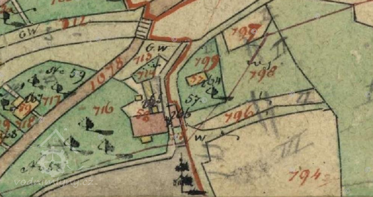 Popis1930: 1 kolo na svrchní vodu, hltnost 0,097 m3/s, spád 8,02 m, výkon 6,7 m