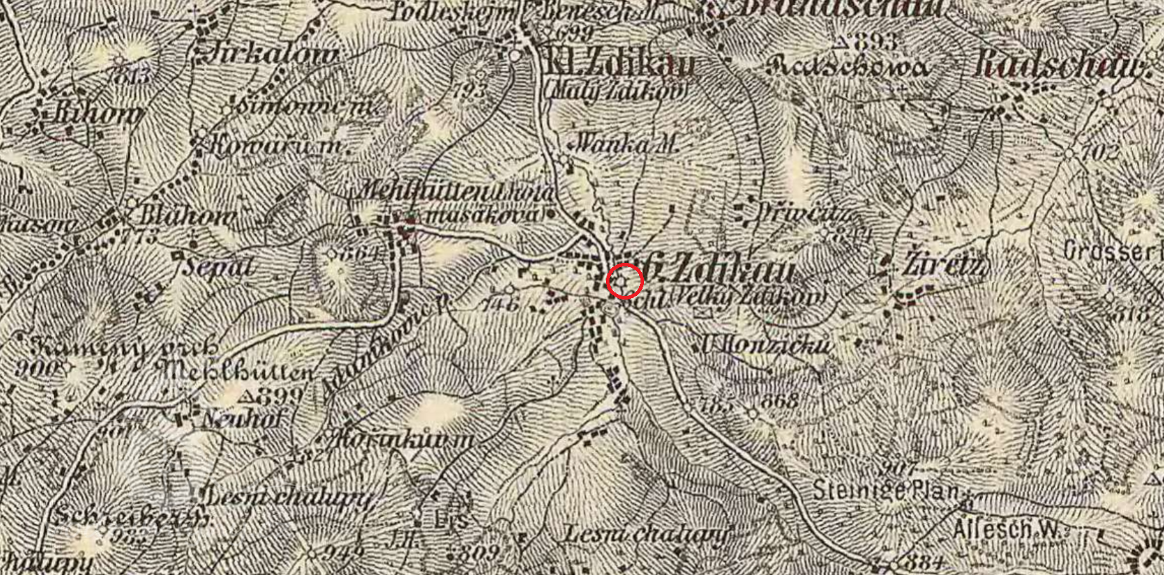 500 m východně od kostela sv. Ludmily ve Zdíkově