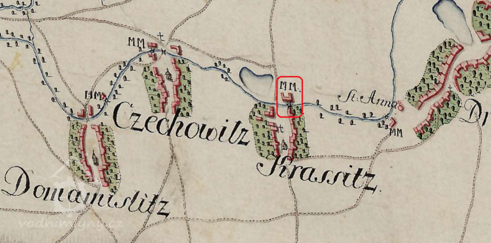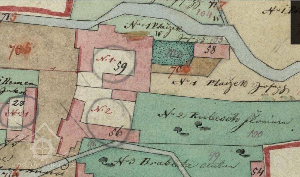 Nesmírně komplikovaný mlýnský areál, složený ze dvou rozsáhlých objektů (staré čp. 1 a 2) na dvou ramenech Čechovického náhonu, za I. republiky přestavěno na továrnu na obuv Wolf & Franže, dnes výrobní haly společnosti GALA a.s., výroba míčů a jiného vybavení pro sport a turistiku. Bez průzkumu na místě nelze stanovit, které části se zachovaly z původních mlýnů.