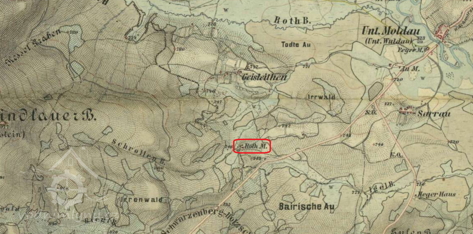 Zaniklý mlýn na samotě mezi Lipenskou přehradou a rakouskou hranicí.