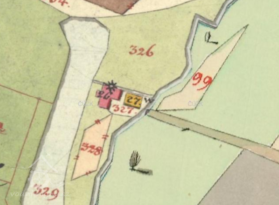 Popis1930: 1 kolo na spodní vodu, celk. hltnost 0,26 m3/s, spád 3,7 m, celk. výkon 8 HP
