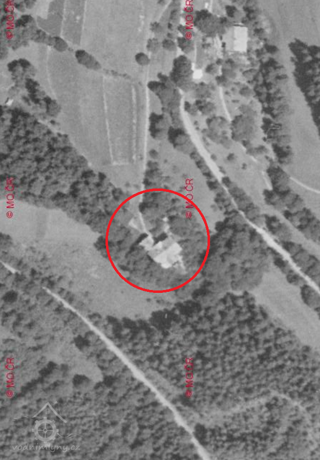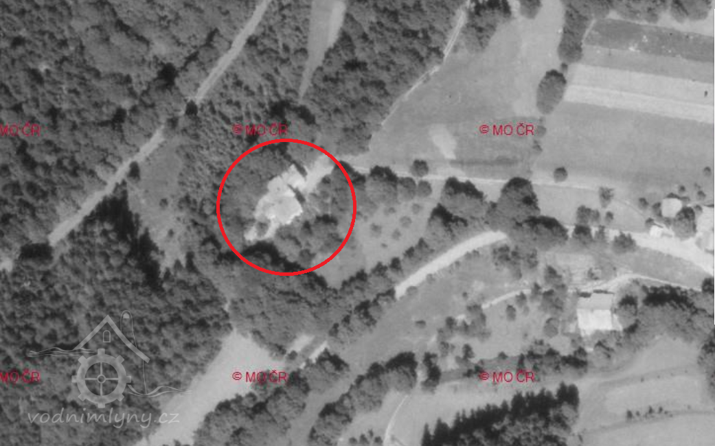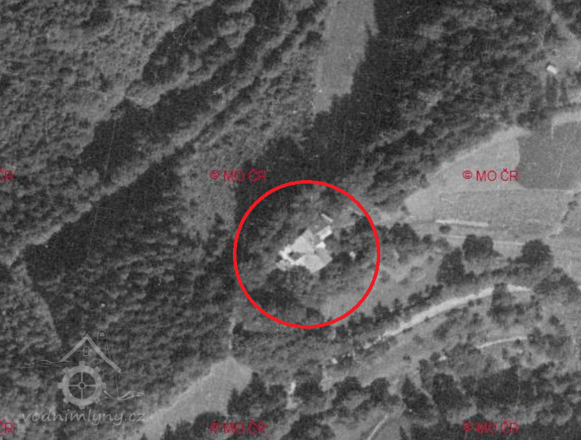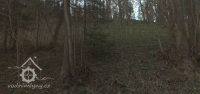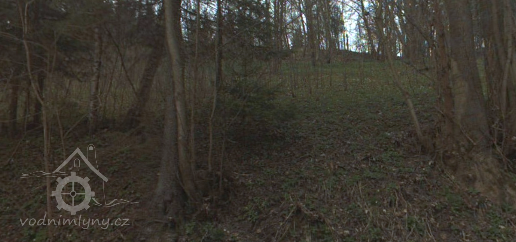 Zaniklý mlýn na dlouhém náhonu, neobvykle položený vysoko ve svahu.